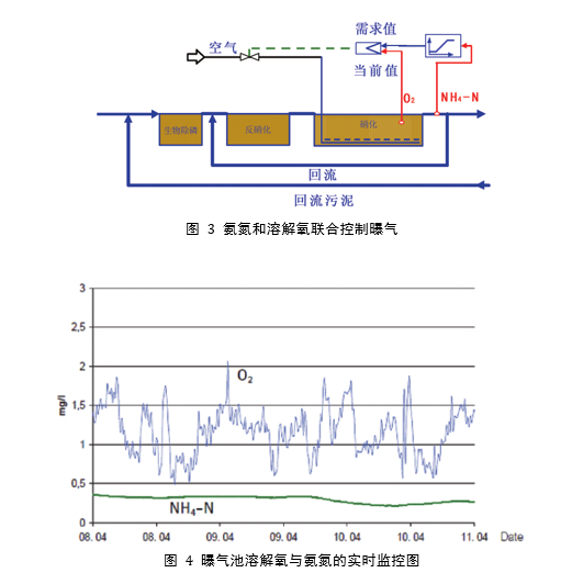 對于大多數(shù)城市污水處理廠,主要的曝氣能耗是氨氮的硝化因?yàn)榇蟛糠值目山到庥袡C(jī)物已在反硝化過程中去除。氨氮在溶解氧的作用下轉(zhuǎn)化為硝氮的過程是整個(gè)脫氮工藝的限速步驟,污水中氨氮對溶解氧的需求直接反應(yīng)了系統(tǒng)對溶解氧的需求。如圖 3所示,通過測得的氨氮濃度和溶解氧濃度,進(jìn)行疊加控制。調(diào)節(jié)曝氣池總管上的空氣閥開啟度,控制供氧強(qiáng)度。濃度一般控制在2mg/L以下,以避免浪費(fèi)能量。同時(shí)也避免由于溶解氧濃度過高而使大量溶解氧通過內(nèi)回流帶入到缺氧區(qū)。