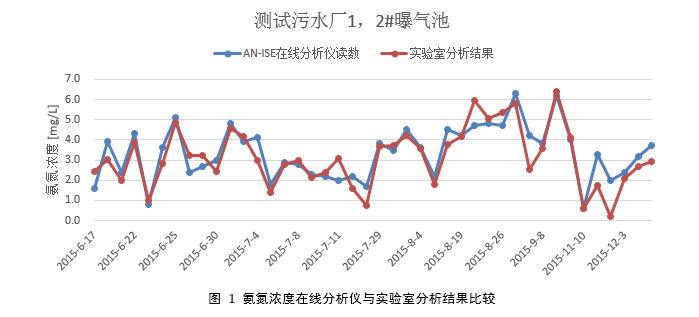 下圖是測試污水廠1,2#曝氣池AN-ISE在線分析儀讀數(shù)與實(shí)驗(yàn)室分析結(jié)果之間的對比。