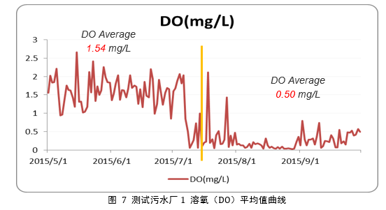 測試污水廠1精確曝氣系統(tǒng)介入前,手動(dòng)控制曝氣池中的溶氧值。由精確曝氣系統(tǒng)介入后,在排放符合標(biāo)準(zhǔn)的前提下,溶氧的平均值由之前的1.54mg/L,降低至自動(dòng)控制的0.50mg/L。風(fēng)機(jī)的總電耗下降了20%左右,單位COD的風(fēng)機(jī)電耗下降10%,節(jié)能效果顯著。