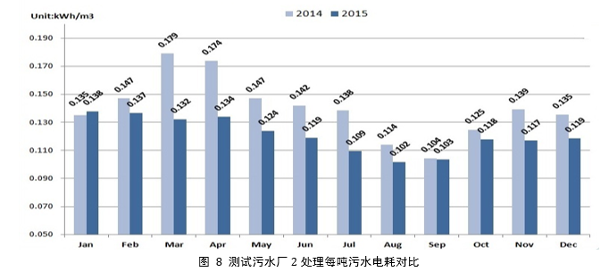 圖 8為測試污水廠2 2014年與2015年處理每噸廢水所需要的電耗對比,在引入精確曝氣系統(tǒng)之后,單位電耗有了明顯降低,從2014年的0.140kWh/m3下降至從2015年的0.121kWh/m3,單位能耗下降13.5%,節(jié)能效果顯著。以一個(gè)日處理量為10萬噸的污水廠為例,利用AN-ISE在線分析儀的測量值來對風(fēng)量進(jìn)行精確控制,處理每噸污水節(jié)約電耗0.02kWh,電費(fèi)以0.7元/kWh計(jì),每年僅在風(fēng)機(jī)降耗上就能夠節(jié)約電費(fèi)約為51萬元。