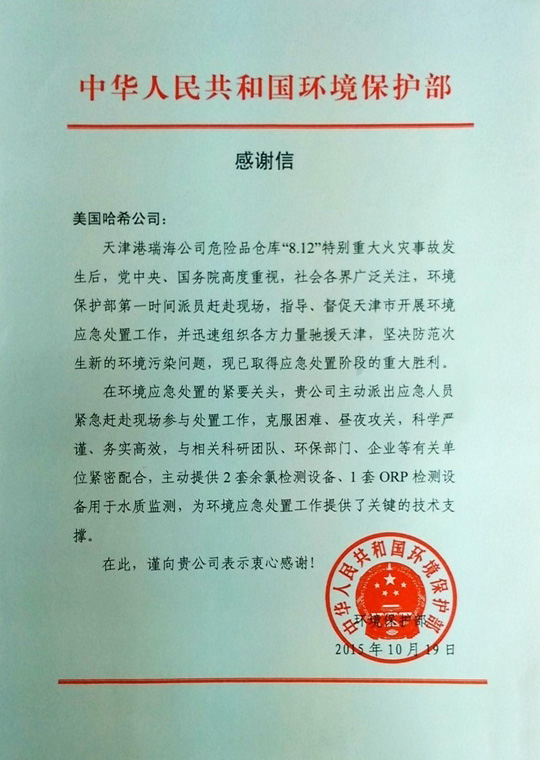 日前哈希收到一封來自中國環(huán)境保護部的感謝信,對于哈希公司在“8.12”天津港爆炸事故應(yīng)急處置的緊要關(guān)頭給予的無私援助與大力支持表示感謝。這讓我們既榮幸,也為自己的工作能給天津港的群眾帶去幫助感到欣慰。