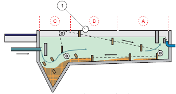如下圖2所示,同樣B區(qū)也是較為理想的安裝區(qū)域。目前在平流式的沉淀池中,安裝在C區(qū)的情況較為普遍,產(chǎn)生的問(wèn)題有:1、探頭安裝位置與池壁過(guò)近,回波中的干擾信號(hào)會(huì)影響測(cè)量值的準(zhǔn)確性;2、底部污泥斗過(guò)于陡峭,SONATAX sc探頭無(wú)法準(zhǔn)確測(cè)量出池底深度(注意:在某些平流式沉淀池的設(shè)計(jì)中,污泥斗底部為水平結(jié)構(gòu),SONATAX sc可以準(zhǔn)確測(cè)量出池底深度。此時(shí),污泥斗的正上方可以作為理想的安裝位置)